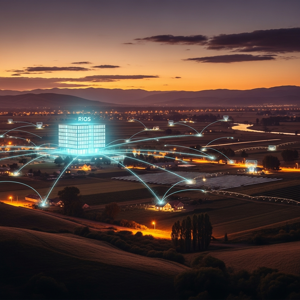 A thriving rural valley at dusk. A central, modern building glows with a soft RIOS-cyan light, and faint, glowing lines of data are shown connecting the entire community back to this hub. The RIOS Campus Standard is visualized as the heart of the community.